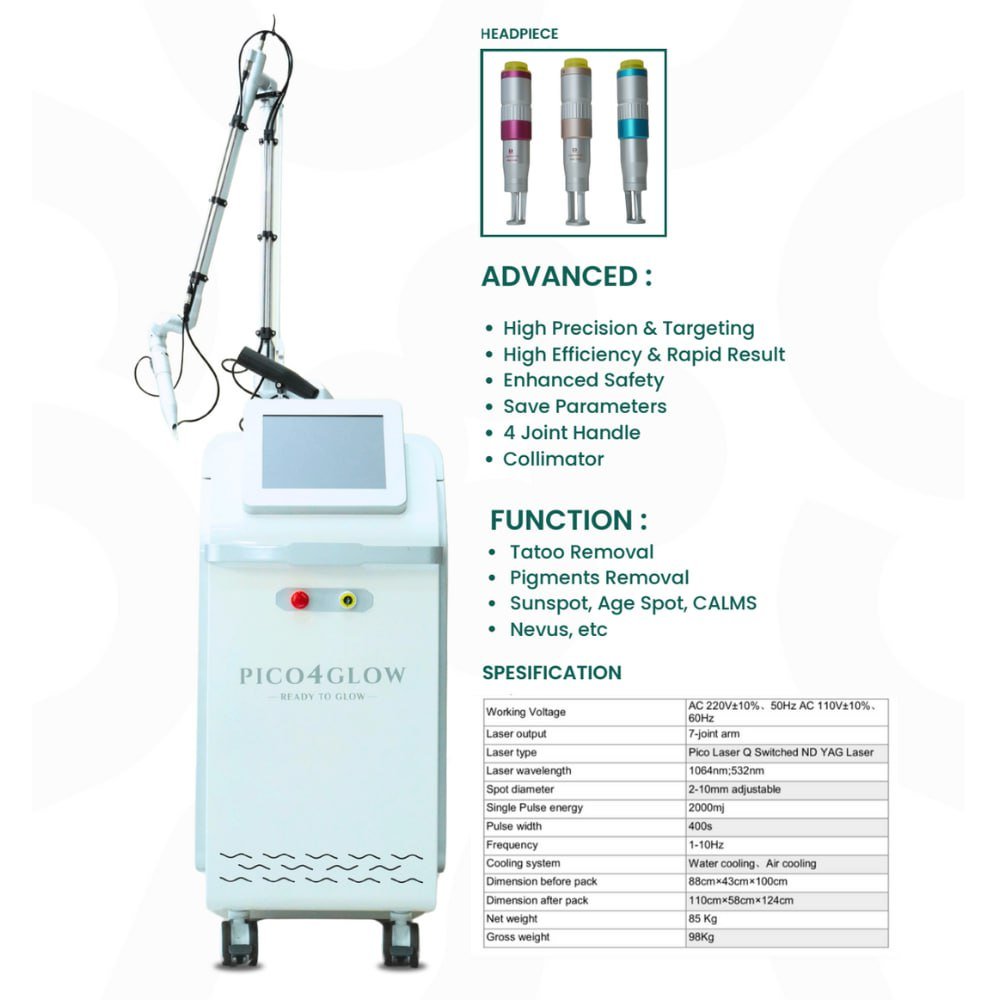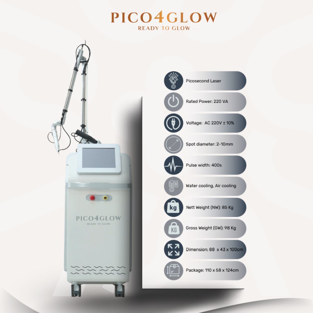 Pico4Glow adalah mesin laser picosecond profesional dengan teknologi ND : YAG 1064 nm & 532 nm , dilengkapi Fractional Collimator Tips untuk hasil lebih presisi dan cepat.